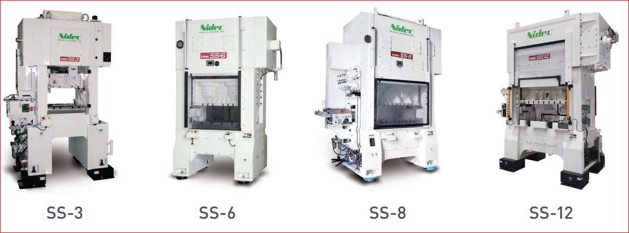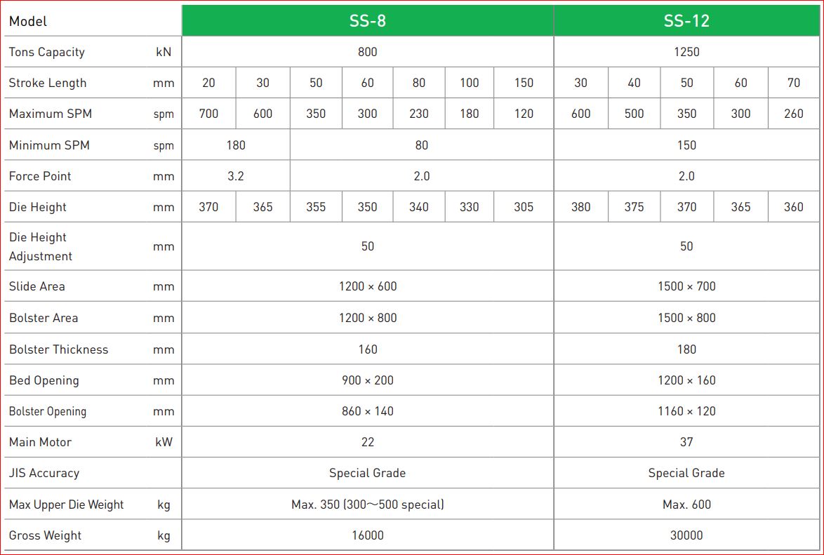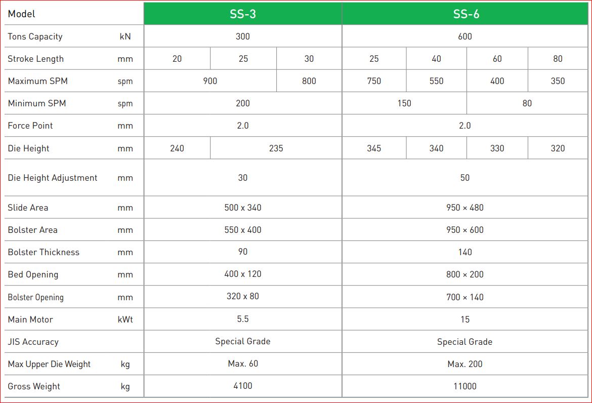Its crown, column and bed tightened by tie-rod --- a high-rigidity frame, 8 face slide guide structure --- tolerate eccentric load (4 face slide structure for SS-3), a wide space for die fitting, as great running accuracy as upper class series (thermal displacement, bottom dead center repeat accuracy)
